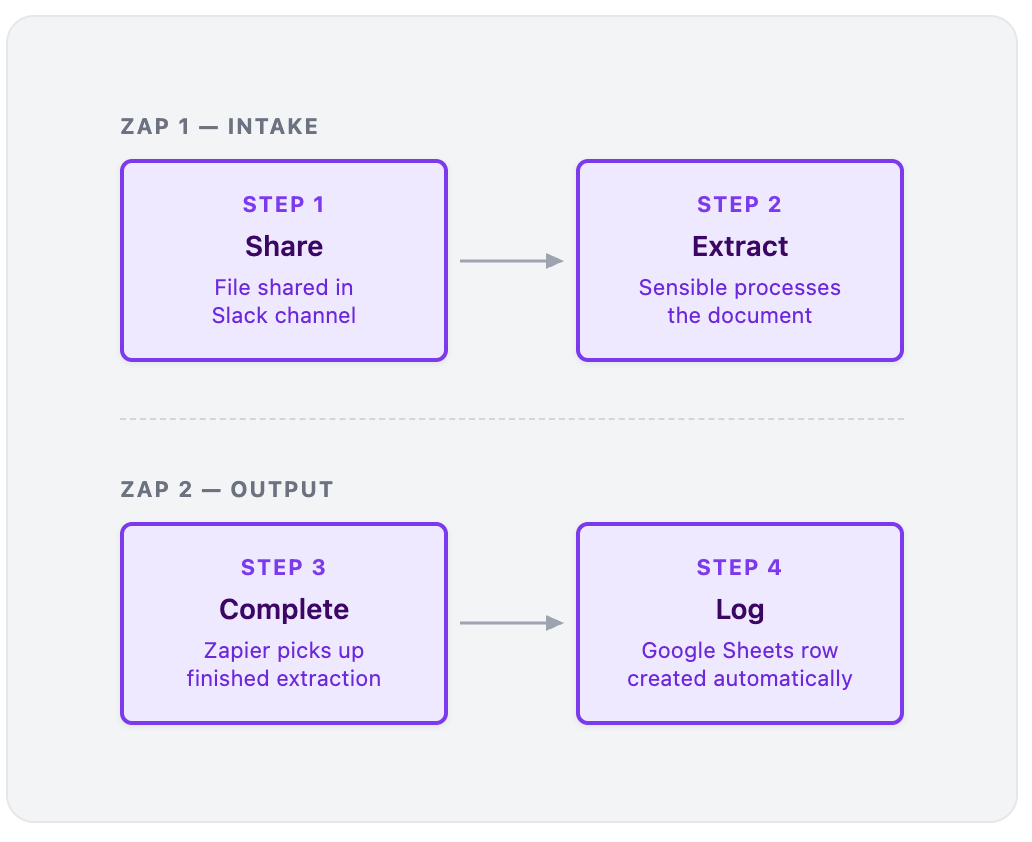 Sensible acts as the extraction layer between Slack and Google Sheets. Drop a PDF into Slack. A row appears in Google Sheets. This two-Zap workflow removes that manual step entirely -- no copy-paste, no cleanup, no manual entry.