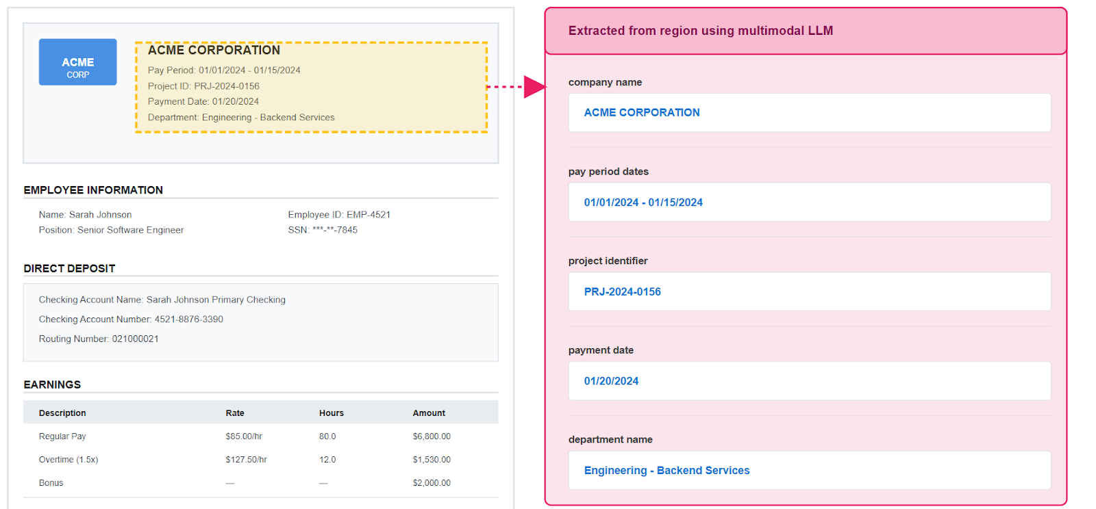 When OCR simply cannot read a region, there’s a fallback multimodal LLM extraction approach. First, define a bounding box using deterministic layout text anchors (generally headers), then let the LLM interpret just that region. This keeps extraction predictable while handling spots that would otherwise require manual review. For example, in the following image, the extraction deterministically anchors on “ACME CORPORATION”, defines a rectangular region in inches, and then prompts the multimodal LLM to extract the data in the region.