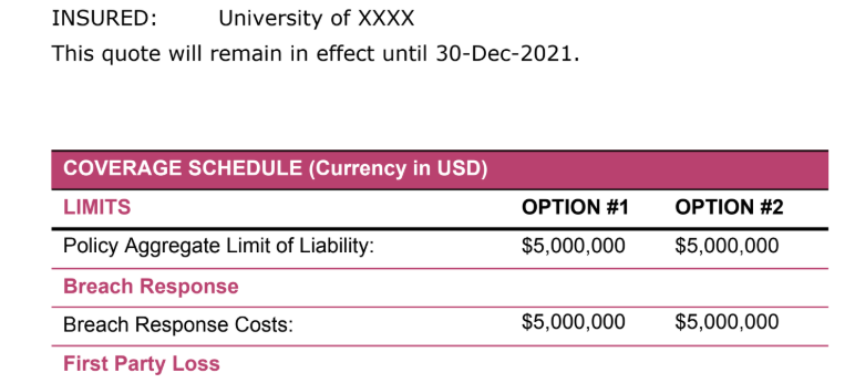 Beazley's Coverage Schedule presents two side-by-side options with limits listed by coverage type in rows. The tiebreaker parameter extracts each option from the same anchor independently: "first" returns the Option 1 value, "second" returns Option 2. In this quote, both options carry the same aggregate limit. The same tiebreaker pattern extracts any field in the coverage grid where values differ by option: retentions, sublimits, and per-coverage amounts all follow the same two-column structure.