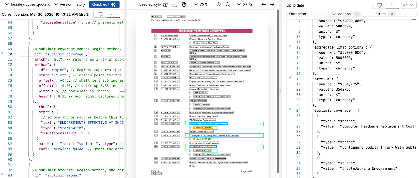 This post walks through a Beazley cyber quote using a deterministic layout config. The same approach applies to cyber quotes from any carrier, and to other commercial lines quote types: GL, E&O, D&O, property, and umbrella.