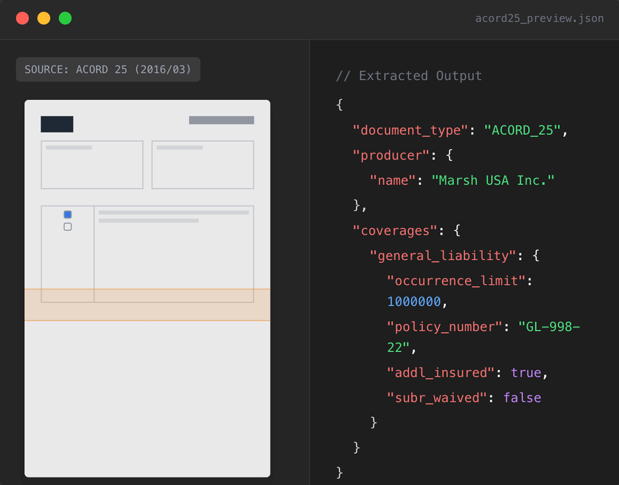 We accurately distinguish between "X", "Checkmark", and empty boxes for fields like Additional Insured and Waiver of Subrogation.
